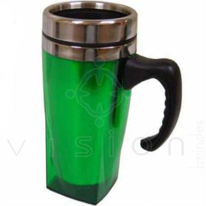 Caneca de 450ml com tampa, base quadrada, internamente com inox e externamente em acrí­lico. Com cabo na cor preta.