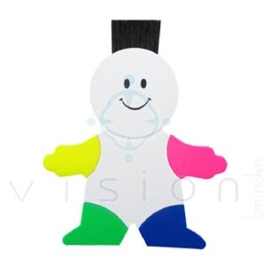 Caneta marca texto no formato de boneco com 4 cores, com limpador de teclado e limpador de tela, fabricado em material plástico, e embalada individualmente em saquinho plástico.
