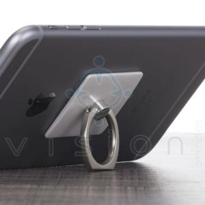 Suporte plástico para celular com alça giratória, parte traseira com adesivo. Para utilizar basta tirar o lacre e colar a peça na parte traseira do celular, pode ser utilizado como suporte para manter o celular em pé ou utilizado como anel anti-furto.