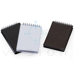 Bloco de anotações de couro sintético com suporte para caneta, frente e verso liso. Abertura superior, possui espiral prata e acompanha aproximadamente 95 folhas brancas sem pauta e suporte na lateral direita para caneta (não acompanha caneta).