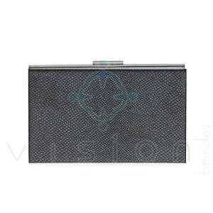 Porta cartão em couro sintético texturizado com detalhes em metal brilhante na lateral e parte superior. Parte interna com metal fosco.