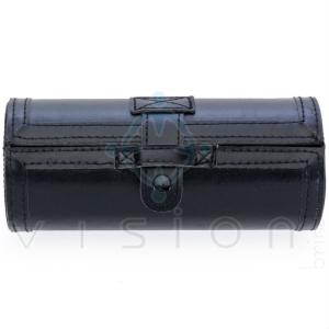 Kit engraxate em estojo com 5 peças. Possui esponja umedecida, escova de madeira, flanela preta, cera preta e calçadeira. Parte interna revestida de veludo com elásticos para fixar as peças. Estojo couro sintético em formato cilíndrico.