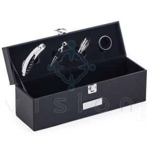 Kit vinho 4 peças com estojo couro sintético, alça em couro e trava metálica.