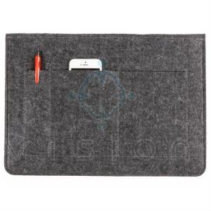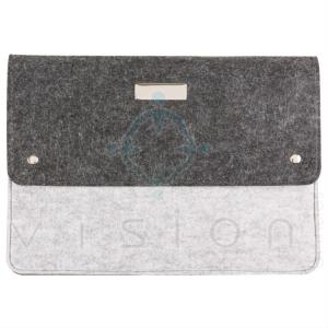 Pasta envelope com forro e dois bolsos internos. Tecido de feltro com tonalidade mais clara na parte interna e dois botões prata que podem ser encaixados em dois tamanhos. Possui também no verso outros bolsos: dois para documentos e um para canetas. Acompanha placa metálica para personalização.