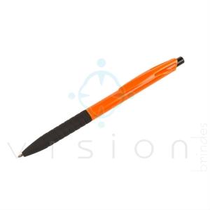 Caneta plástica inteira colorida com detalhes prata. Clip "acoplado" ao corpo da caneta, possui anel superior e inferior prata. AcionCaneta plástica branca com detalhes coloridos. Clip plástico com detalhe vazado nas laterais, acionador e parte inferior colorida com oito anéis em relevo. Aciona por clique.