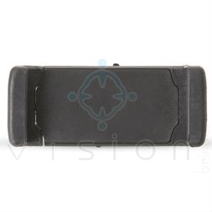 Suporte veicular para celular com acabamento plástico, parte traseira com garras plásticas giratórias (possui rosca para firmar o encaixe) para acoplar na tela do ar condicionado.