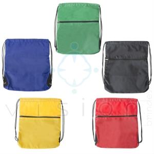 Sacola Tipo Mochila em nylon com duas alças para costa, fechamento superior e compartimento frontal com zí­per.