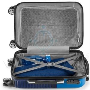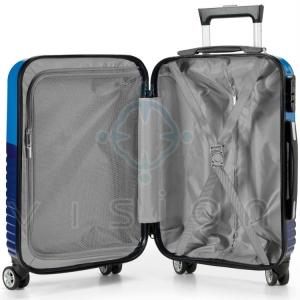 ABS e PC. Interior forrado, com divisória. 4 rodas duplas giratórias.