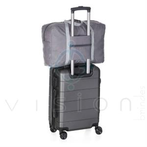 Bolsa de viagem dobrável confeccionada em poliéster e alça para mãos em nylon.
