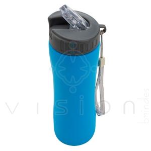 Squeeze metal 600ml com tampa rosqueável plástica e bico transparente de acionamento manual. Acompanha alça de nylon.