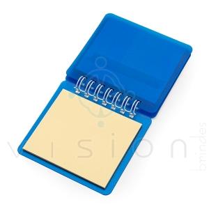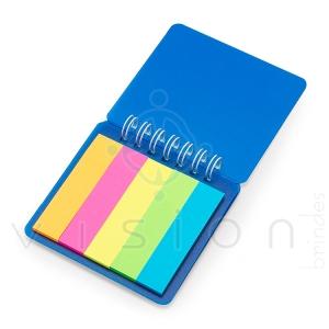 Bloco de anotações plástico com autoadesivos. Contém cinco blocos autoadesivos coloridos com aproximadamente 25 folhas cada e bloco amarelo com aproximadamente 25 folhas.