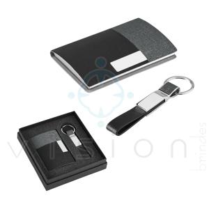 Kit de porta cartões e chaveiro em c. sintético e metal. Fornecido em caixa almofadada. Medidas: Chaveiro: 15 x 92 x 8 mm | Porta cartões: 97 x 65 x 11 mm | Caixa: 154 x 143 x 34 mm