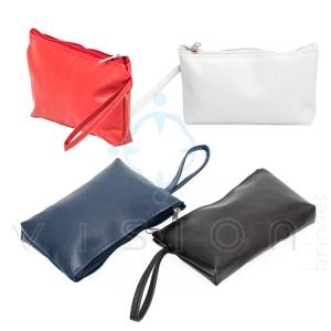 Nécessaire em couro sintético resistente à água, com alça para transporte, prática e elegante.