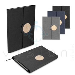 Caderno de anotações, capa em tecido RPET e detalhe em bambú.