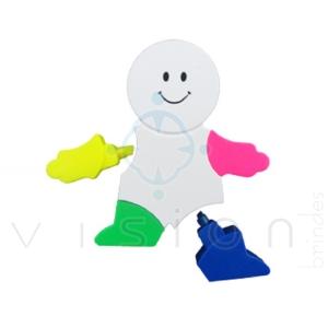 Caneta marca texto no formato de boneco com 4 cores, com limpador de teclado e limpador de tela, fabricado em material plástico, e embalada individualmente em saquinho plástico.