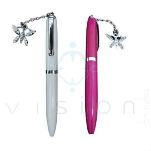 Caneta de metal com correntinha em formato de borboleta.