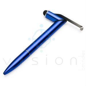 Caneta plástica base para celular e com ponteira touch. Corpo colorido com detalhes prata, parte superior aonde fica o clip plástico é giratória(basta rotacionar para posicionar como base para celular) e borracha touch superior. Aciona por giro.