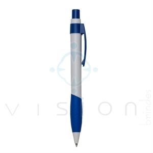 Caneta plástica inteira branca com detalhes coloridos. Clip plástico com detalhes em relevo superior, parte inferior emborrachada com detalhes em relevo. Aciona por clique.