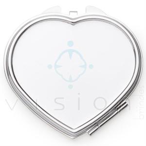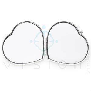 Espelho de metal duplo em formato coração com aumento. Frente lisa espelhada e verso texturizado.