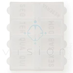 Porta Comprimidos Semanal PC29531 Porta comprimidos semanal de plástico branco fosco. Possui oito divisórias, sete delas escrito em relevo os dias da semana e a última escrito "reserva". Verso liso. Medidas: 6,8 cm x 7,6 cm Gravação Silkscreen - 1 cor Silkscreen - 2 cores Silkscreen - 3 cores Silkscreen - 4 cores Alta Definição sem Limite de Cores Quant. 1 Quant. 2 Quant. 3 Qtd minima: 100 Você pode orçar até 3 quantidades diferentes do produto. (: 100 ) • • produtos relacionados Bola anti-stress Coração BASC desejo orçar Porta Comprimido Plástico XVB2454 desejo orçar Kit manicure com 15 peças V721 desejo orçar Porta comprimidos SVB1552 desejo orçar Kit Banho 6 Peças XVB3158 desejo orçar Conjunto de 6 lixas SVB1625 desejo orçar