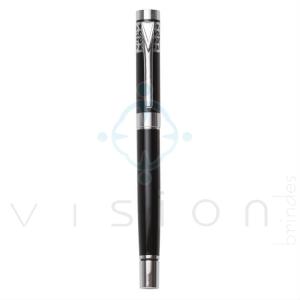 Caneta metal tinteiro preta com detalhes prata. Clip metálico prata com desenho ao redor, possui anel superior e inferior preto. Parte interna com “seringa†para filtrar tinta da carga de “garrafaâ€. Caso tenha o cartucho de tinta não é necessário utilizar a seringa, basta colocar o cartucho no lugar.