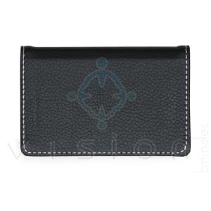 Porta cartão em couro sintético texturizado com chapa de aço escovado superior e costura branca. Parte interna metal brilhante inferior e carcaça escovada.