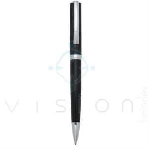 Caneta metal preta texturizada com detalhes prata. Clip prata metálico, possui anel central e ponteira prata. Corpo inteiramente texturizado por "pontinhos", apenas uma parte superior lisa para aplicar personalização. Aciona por giro.