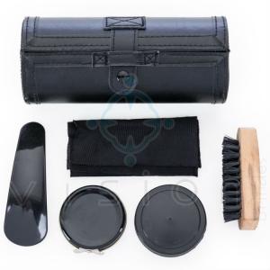 Kit engraxate em estojo com 5 peças. Possui esponja umedecida, escova de madeira, flanela preta, cera preta e calçadeira. Parte interna revestida de veludo com elásticos para fixar as peças. Estojo couro sintético em formato cilíndrico.
