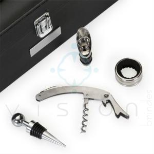 Kit vinho 4 peças com estojo couro sintético, alça em couro e trava metálica.