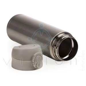 Garrafa térmica de 450ml de metal inteira colorida com botão de abertura prata. Possui um sistema de trava
