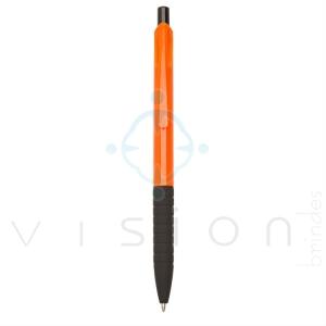 Caneta plástica inteira colorida com detalhes prata. Clip "acoplado" ao corpo da caneta, possui anel superior e inferior prata. AcionCaneta plástica branca com detalhes coloridos. Clip plástico com detalhe vazado nas laterais, acionador e parte inferior colorida com oito anéis em relevo. Aciona por clique.