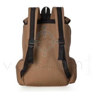 Mochila lona de algodão para notebook. Compartimento superior além de zíper possui fecho com fivelas para maior segurança(parte interna com bolso para notebook), compartimento menor com bolso frontal de nylon e dois bolsos laterais. Alças ajustáveis e alça de mão em nylon. Acompanha plaquinha metálica para personalização.