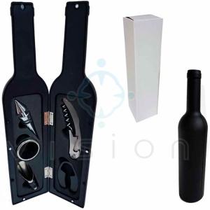 Kit para Vinho com 5 peças e Estojo Plástico no Formato de Garrafa.