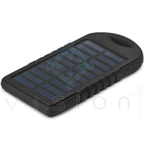 Bateria portátil solar. ABS. Com painel solar e LED. Bateria de lí­tio. Capacidade: 2.000 mAh. Com entrada/saí­da 5V/1A e 2 portas USB. Incluso cabo USB/micro USB para carregar a bateria.