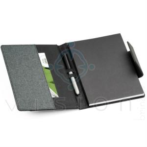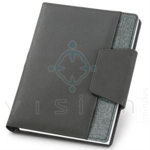 Caderno removí­vel com capa em couro sintético e tecido em poliéster.