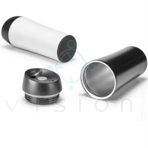 Copo para viagem em aço inox e PP com parede dupla, tampa com sistema anti derrame e antideslizante na base. Capacidade até 470 ml.