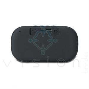 Área frontal com revestimento em tecido e falante central com plaquinha metálica, parte inferior contém borrachas antideslizante.