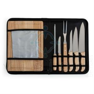 Acompanha tábua em bambu com canaleta, 3 facas de corte e uma faca de serra cabo, chaira, garfo e avental prata com bolso. Acomodados em uma maleta de nylon preta. Rebites em Aço Inox, um dos mais resistentes à ferrugem e corrosão.