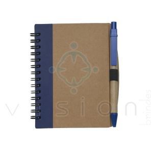 Bloco de anotações ecológico com caneta, capa produzida em papelão com detalhe lateral texturizado e verso liso. Contém miolo com folhas pautadas, suporte de nylon e acompanha caneta de papelão com detalhes plásticos, carga esferográfica na cor azul e acionamento por clique. Medidas: 14X12cm